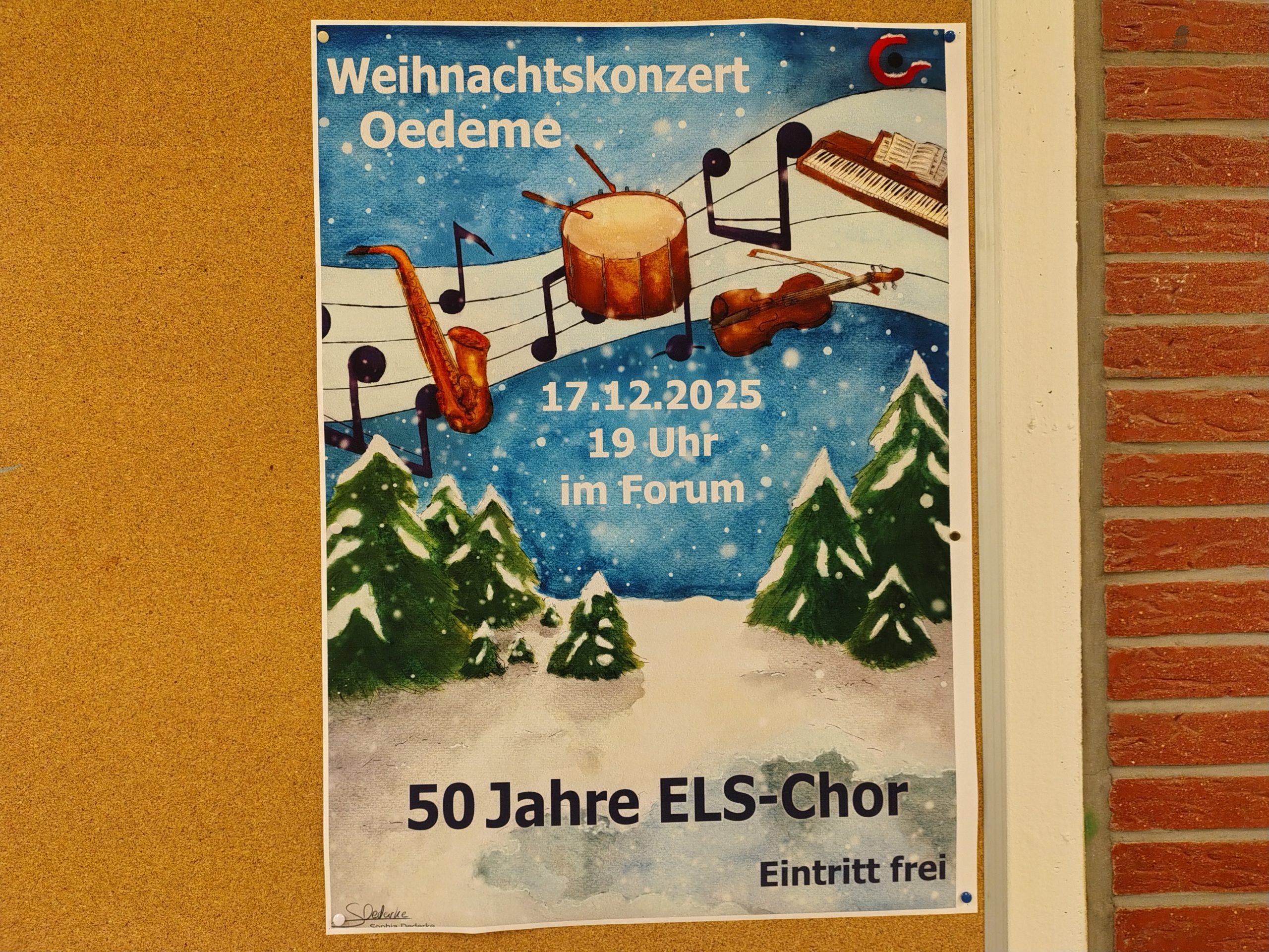 Berlin/ Lüneburg, Deutschland (Kulturexpresso). Rätsel über Rätsel in Niedersachsen! An einem schwarzen Brett hängt ein Plakat, das verkündet: „Weihnachtskonzert Oedeme, 17.12.2025, 19 Uhr im Forum, 50 Jahre ELS-Chor, Eintritt frei“. Steht da so. Auf dem Beitragsbild überprüfbar. Interessant ist, was da nicht steht. Das ist ja auch in der „Tagesschau“ und „Heute-Sendung“ interessant und im Grunde genommen inzwischen fast immer, wenn etwas in der Presse erscheint. Und auf dem Plakat steht etwas, das nur für Eingeweihte verständlich ist, und sogar die müssen es suchen. Symbole. Tja. Nicht nur Schülern kann man raten, sich mal ein SYMBOLE-Buch von dtv oder Dumont zu besorgen, das hilft vielleicht mehr zum Verständnis als das Lesen des ewigen Gefasels von M wie Miteinander bis Z wie Zusammenhalt. Die Erwachsenen und Kinder und Jugendlichen praktizieren das Miteinander.