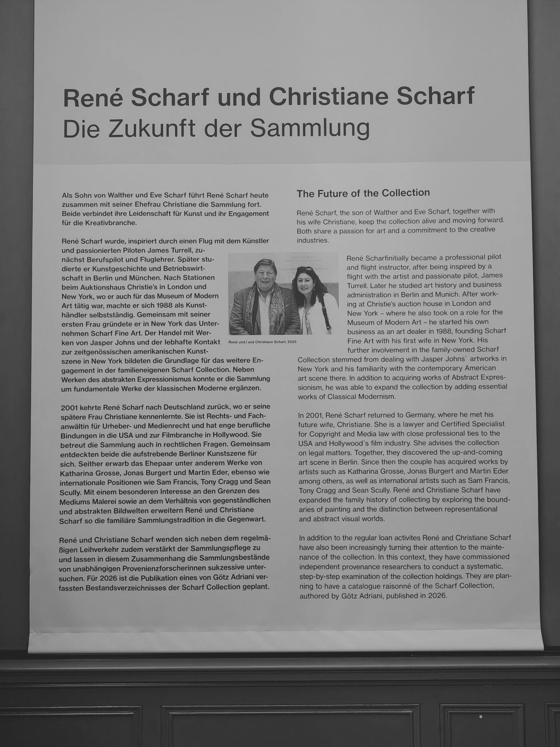Walther Scharf und dessen Frau Eve bauten – auch gemeinsam mit ihrem Sohn René – den französischen Schwerpunkt weiter aus. Sie erwarben Werke von Claude Monet, Paul Cézanne, Pierre Bonnard, Henri Matisse und Pablo Picasso. Heute richten René Scharf und seine Frau Christiane den Blick auf die zeitgenössische Kunst. Ihr Interesse gilt insbesondere den Erweiterungen des Mediums Malerei sowie dem Verhältnis von gegenständlichen und abstrakten Bildwelten. Vor diesem Hintergrund führen René und Christiane Scharf die familiäre Sammlungstradition mit Werken von Sam Francis, Sean Scully, Daniel Richter und Katharina Grosse in die Gegenwart.“