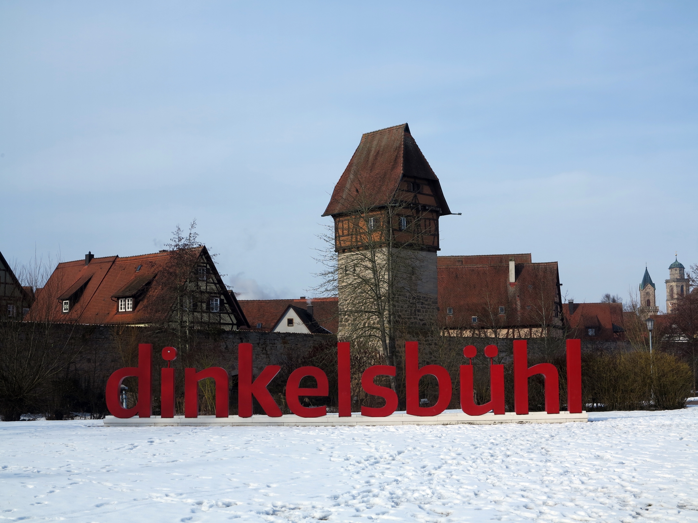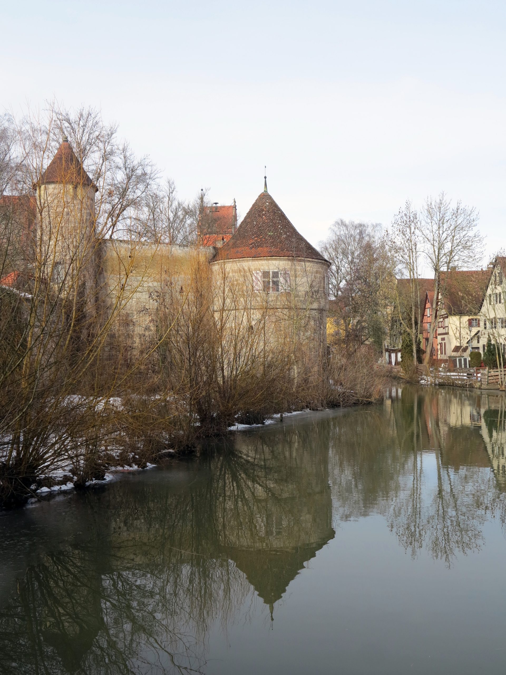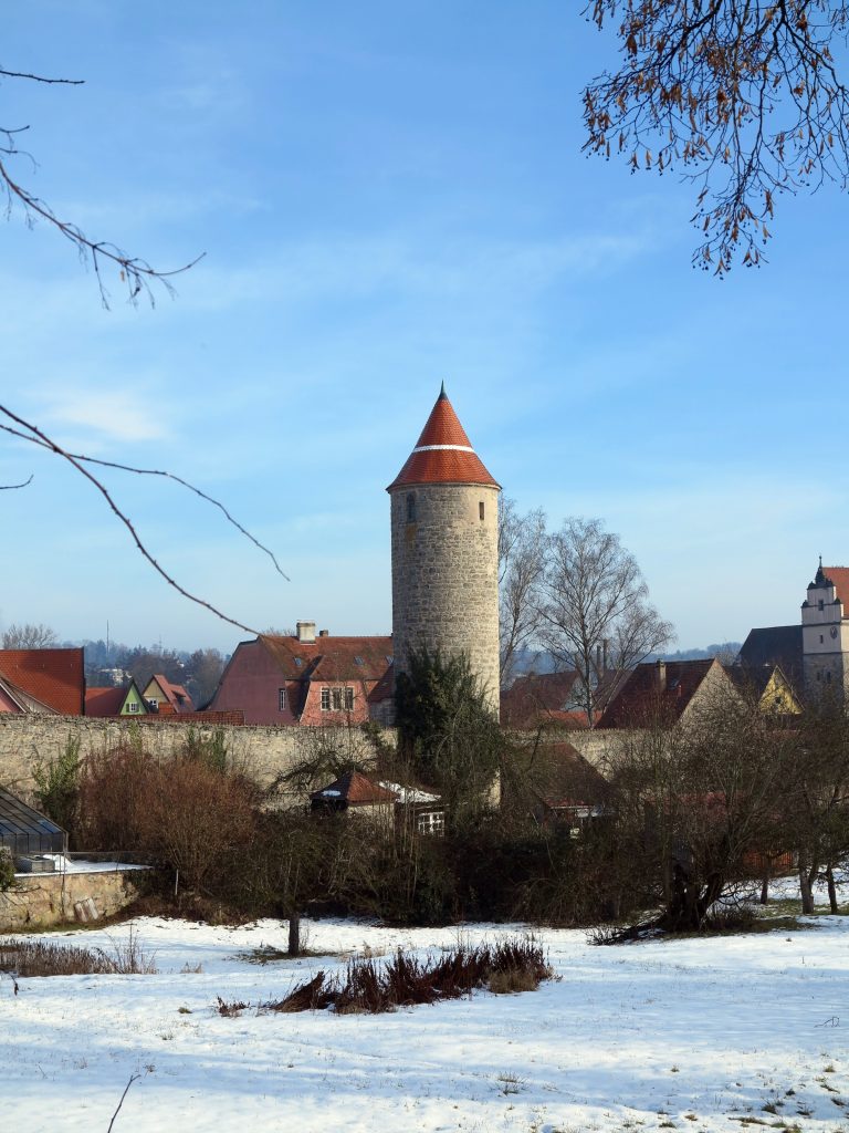 Jetzt stehen wir am winterlichen Rothenburger Weiher mit dem Rothenburger Tor im Hintergrund. Rothenburg, ja. Ewige Konkurrentin in der Frage, wer denn nun die schönste Altstadt in Deutschland hat. Rothenburg hat mit seinen Blicken ins Taubertal und vom Taubertal herauf die großartigere Lage. „Aber Dinkelsbühl ist – auf den ersten Blick – anders als Rothenburg. Eine Stadt mit Alltag, in der es keine ausschwärmenden Touristen gibt, sondern mehr Einzelbesucher“. So hat es Herbert Schindler schon 1975 in seinem immer noch maßgeblichen Kulturführer über die Romantische Straße geschrieben. „Eine jede dieser Reichsstädte ist ja ein eigenes Gebilde nach Lage, Wuchs, Einwohnerschaft, sozialer Struktur und äußerer Erscheinung.“