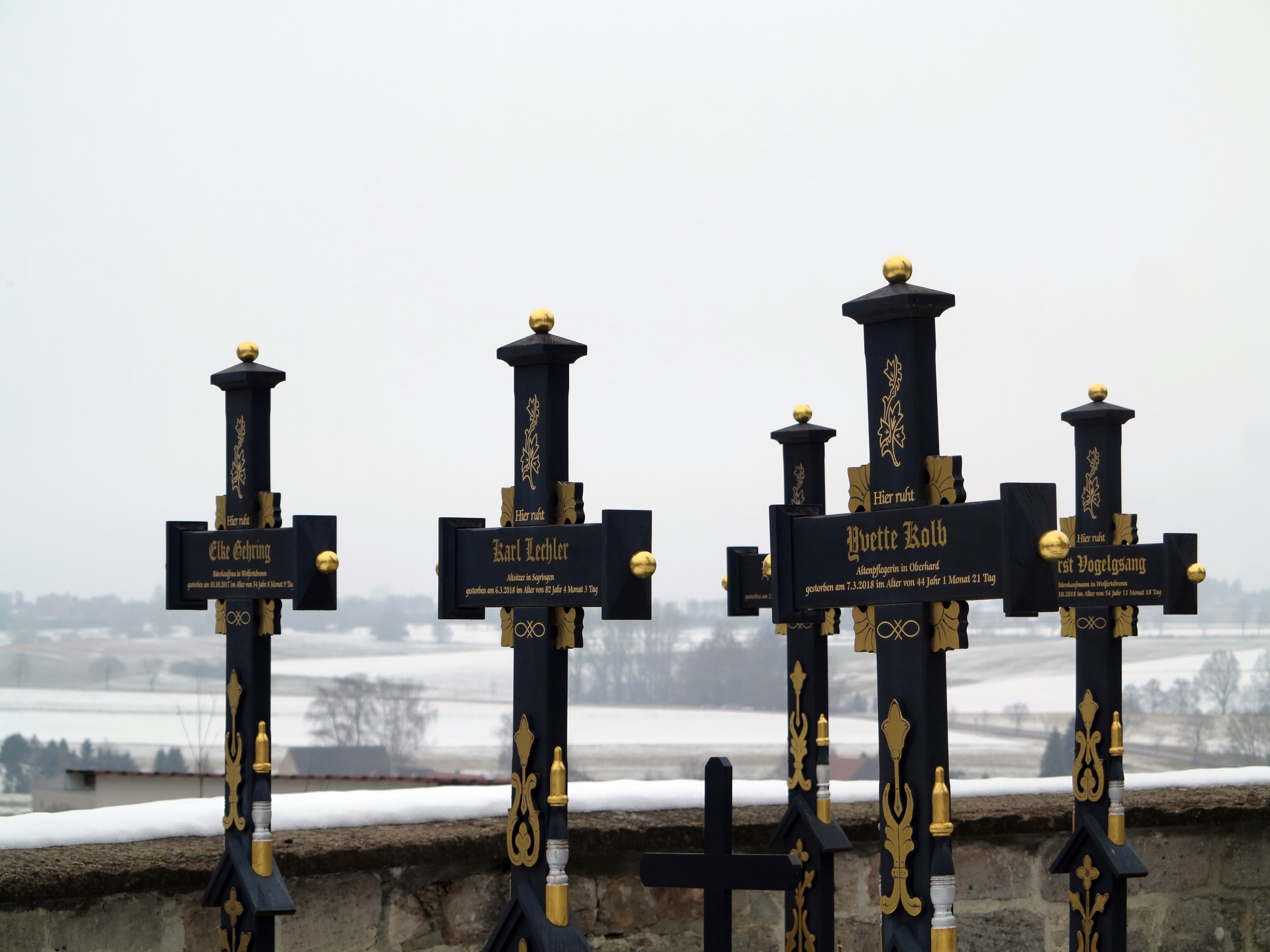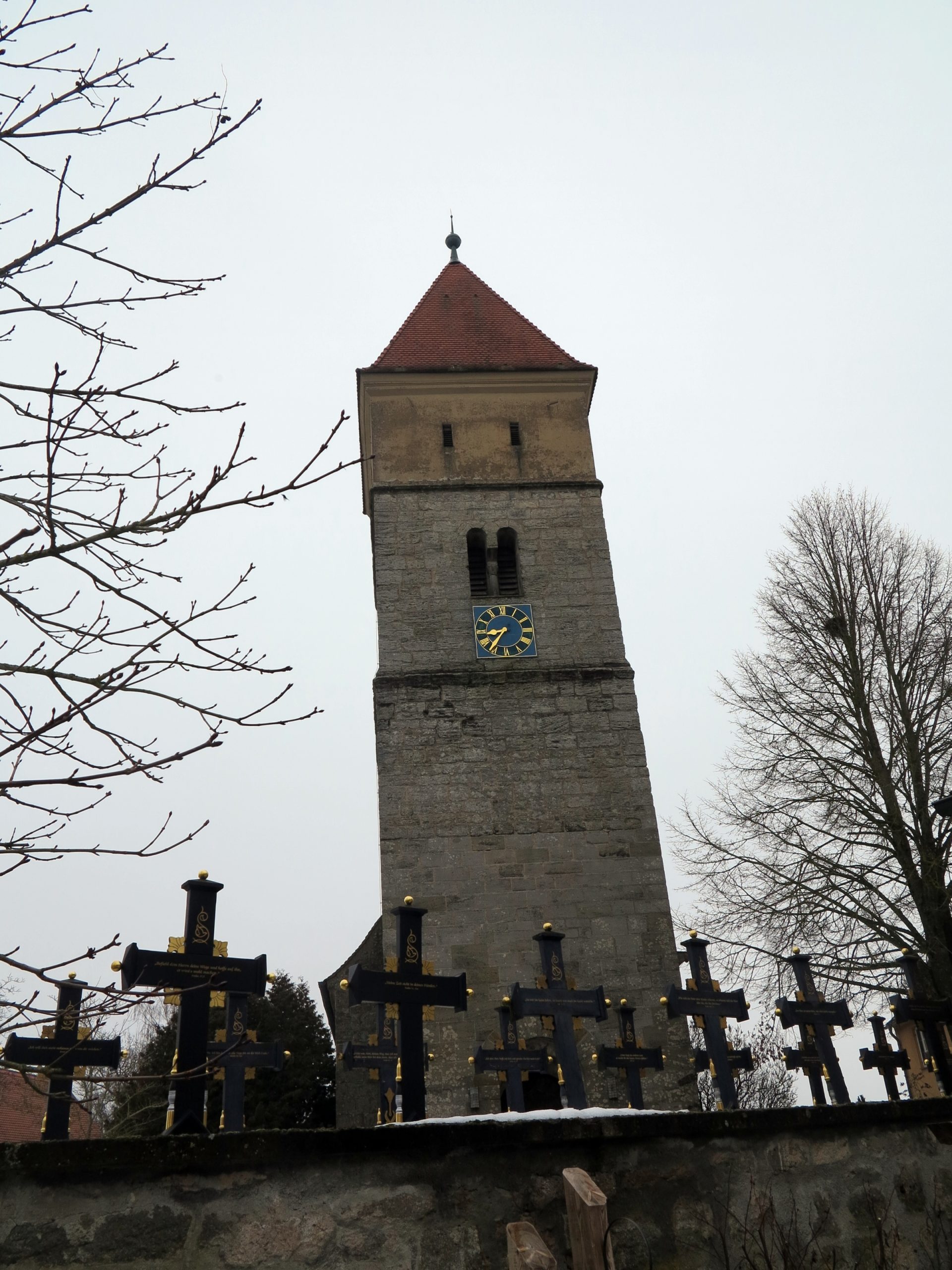 Wir kommen im Dorf Segringen im empfehlenswerten, historischen Landgasthaus Dollinger unter – direkt neben der Pfarrkirche St. Vinzenz, einer ehemaligen Wehrkirche, die in Teilen noch aus romanischer Zeit stammt. Etwas ganz besonderes und auch etwas unheimlich ist hier der Friedhof mit seinen einheitlichen, schwarz-goldenen Grabkreuzen. Auf diesem Friedhof gibt es keine Ehe- oder Familiengräber. Im Tod sind alle alleine – und alle gleich.