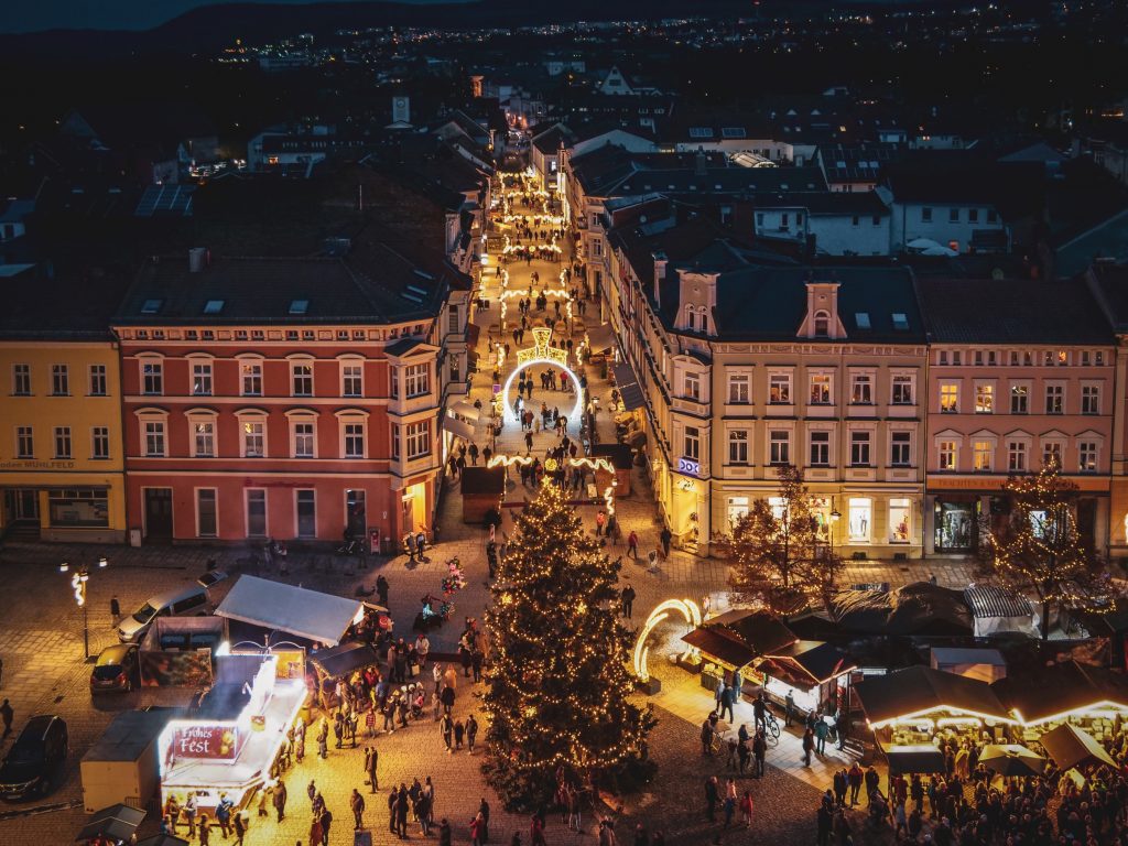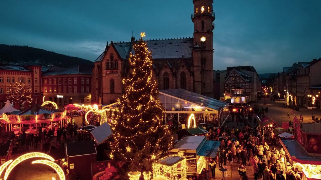 „Meininger Weihnachtszauber“ – so heißt der festliche Weihnachtsmarkt, der vom 24. November bis zum 21. Dezember täglich in der malerischen Innenstadt seine Pforten öffnet. Wie jedes Jahr erstrahlt der Marktplatz vor der imposanten Stadtkirche im Glanz der Adventszeit. Ein besonders romantisches Highlight ist die majestätische Weihnachtspyramide, die in der kalten Winterluft ein warmes, leuchtendes Bild abgibt, sowie die idyllische Echteisbahn. Ob erfahrene Eisläufer oder kleine Anfänger mit der Lauflernhilfe – bei „Meiningen on Ice“ rund um den Heinrichsbrunnen können Groß und Klein ihren winterlichen Spaß haben. Und natürlich sorgen auch in diesem Jahr die festlichen Klänge der Meininger Turmbläser, die vom Turm der Stadtkirche herüber wehen, für eine stimmungsvolle Atmosphäre und lassen den Weihnachtsmarkt noch zauberhafter erscheinen.