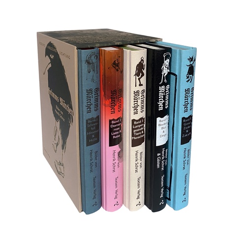 Jacob Grimm, Wilhelm Grimm, Henrik Schrat, Grimms Märchen, Illustrator: Henrik Schrat, Gestalter: Christoph Steinegger, Sprache: Deutsch, Schuber mit allen fünf Bänden in Schmuckkasette, Format: 16,5 × 23,5 x 13,5 cm, Verlag: Textem-Verlag, Hamburg. 1. Auflage 2025, ISBN: 978-3-86485-348-7, Preis: 170 EUR (Deutschland)